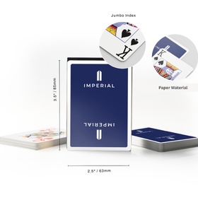 Our standard Paper Playing cards feature a Poker Size (3.5" x 2.5") and a Jumbo Index however Bridge Size (3.5" x 2.25") and Regular Index are also possible on request.
