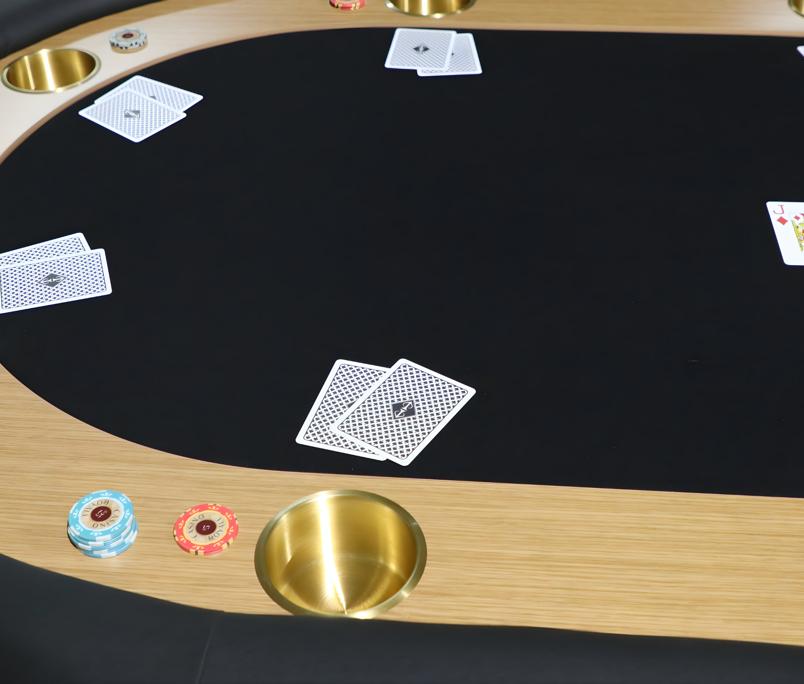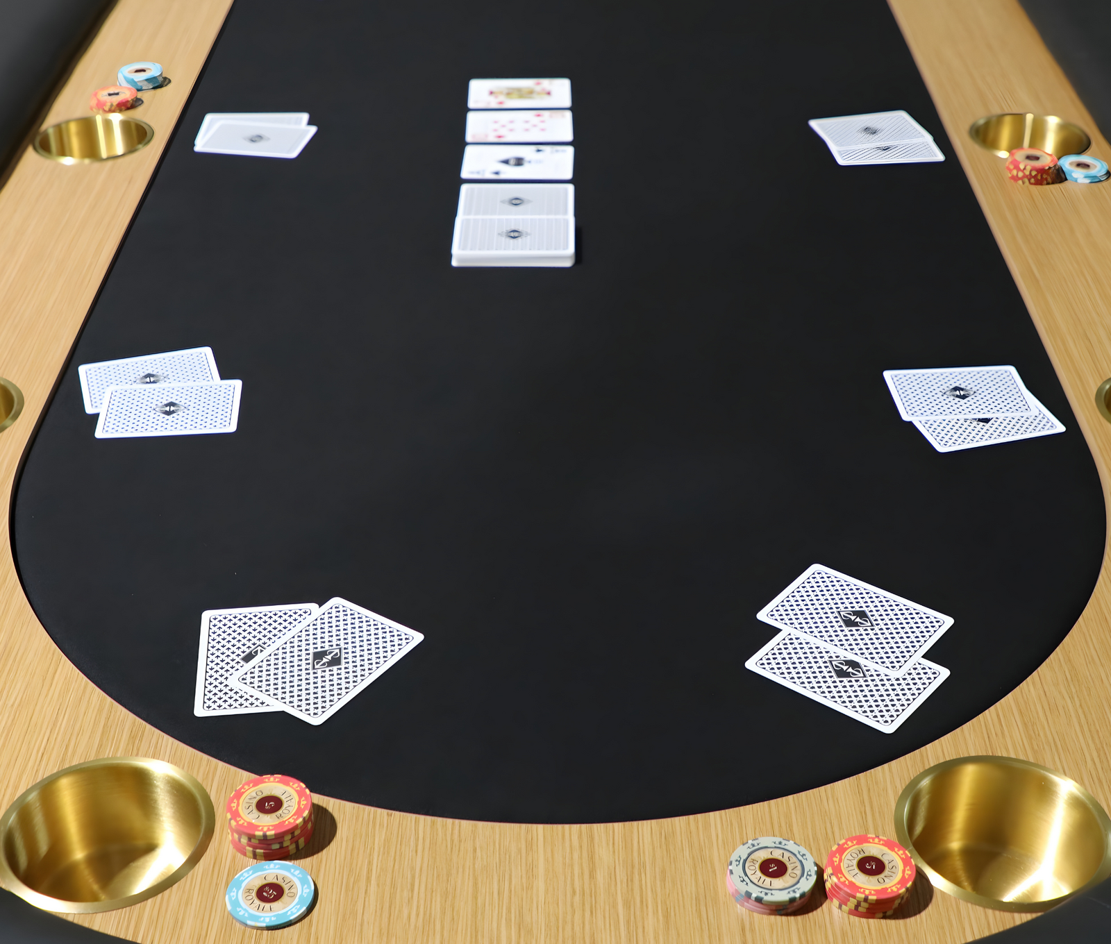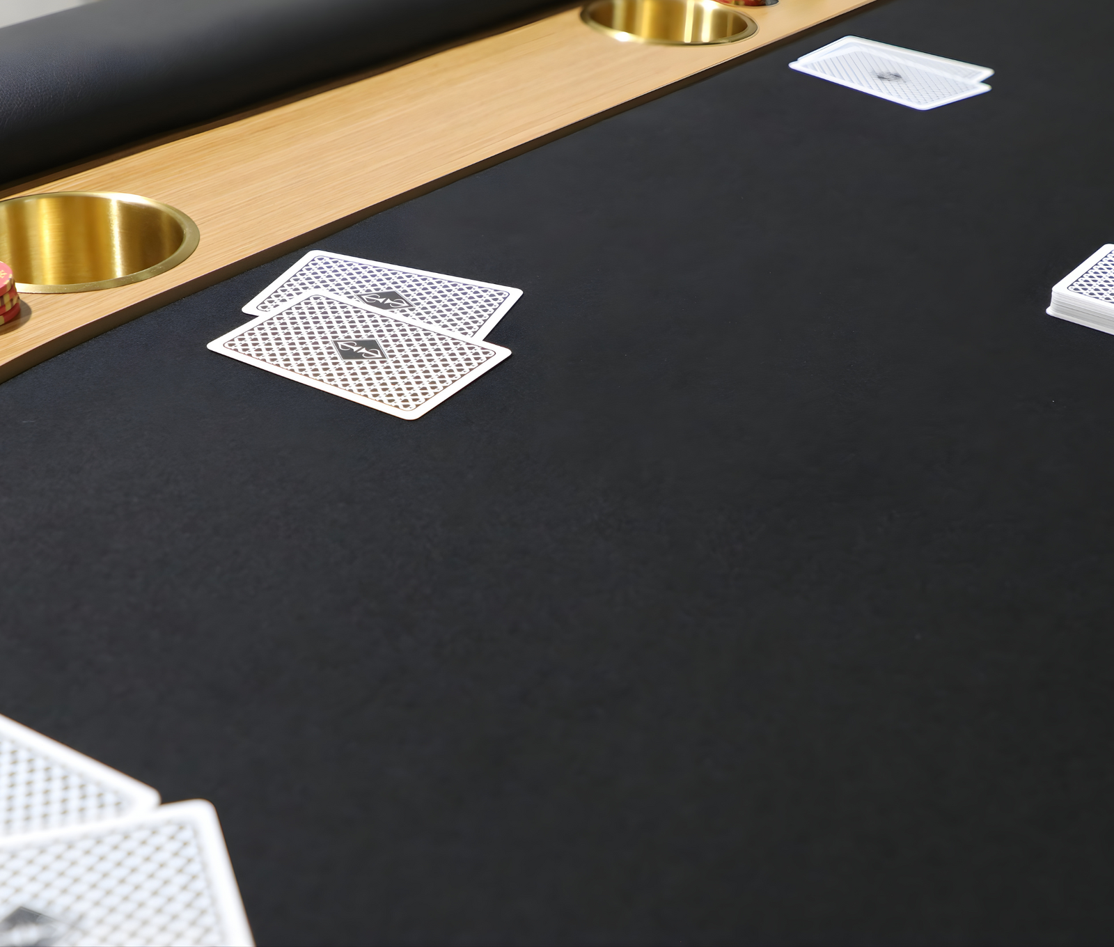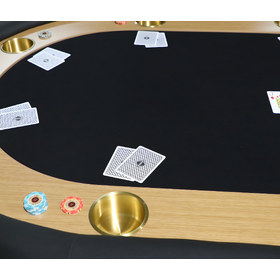 In addition the felt slits slightly recesed below the wooden racetrack, creating a functional area for your game on the felt and avoiding unwanted card exposures from the cards moving from the felt onto the wood.