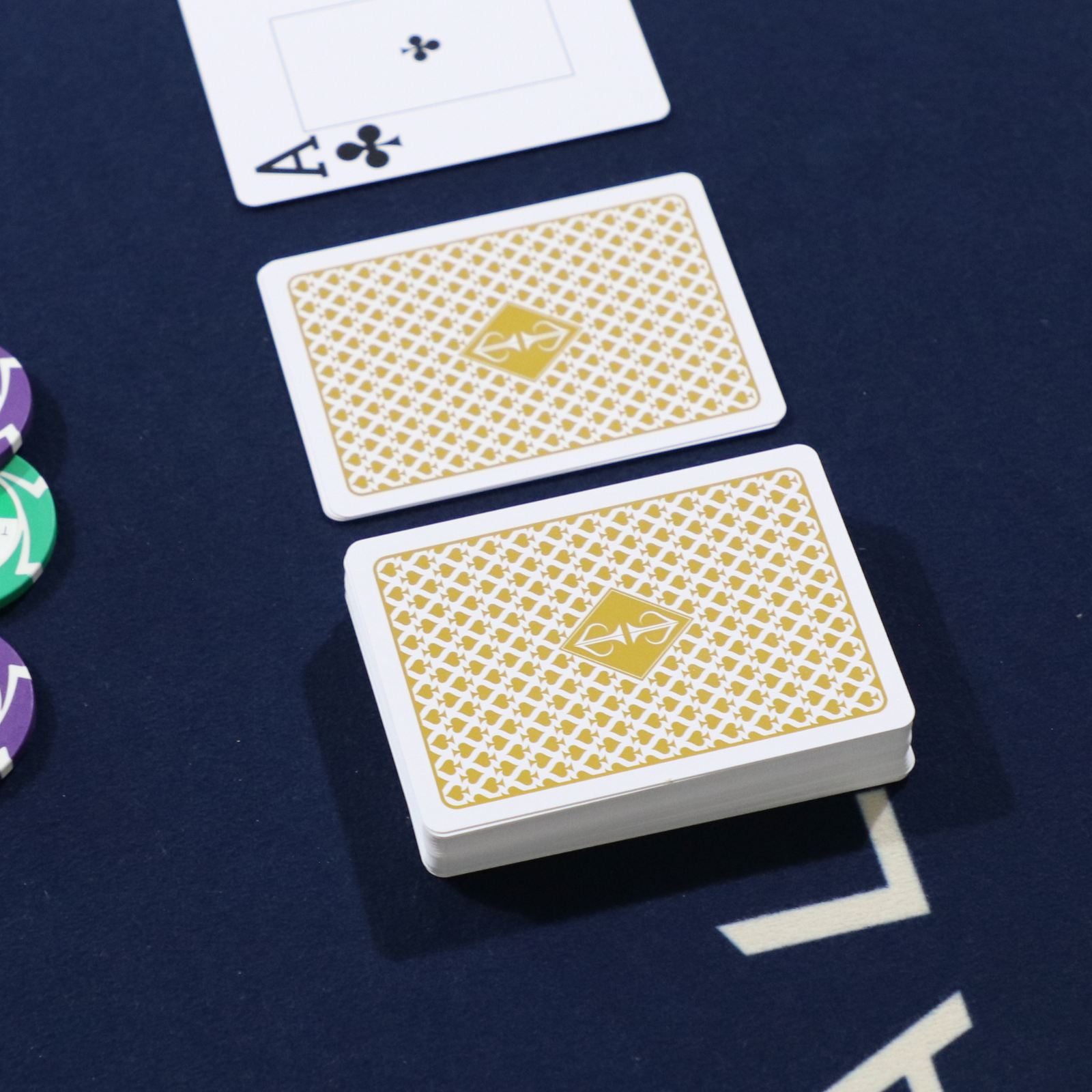 The card backs feature a repeating spade-pattern for a timeless casino aesthetic, complemented by a custom Ace of Spades, unique Jokers, and branded cut card in every deck.