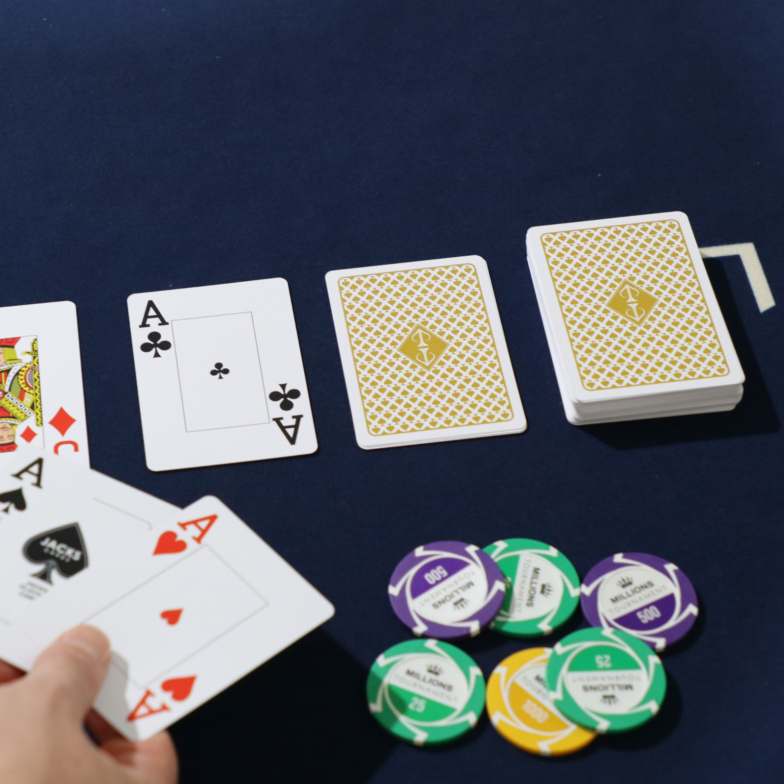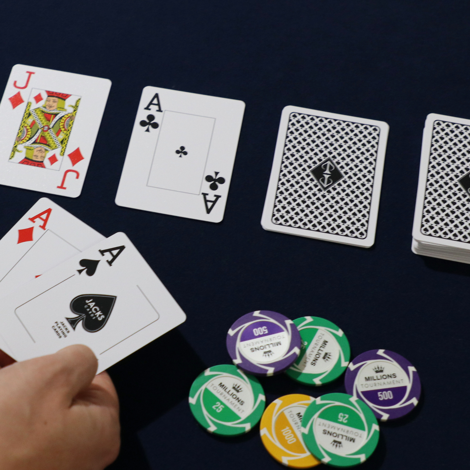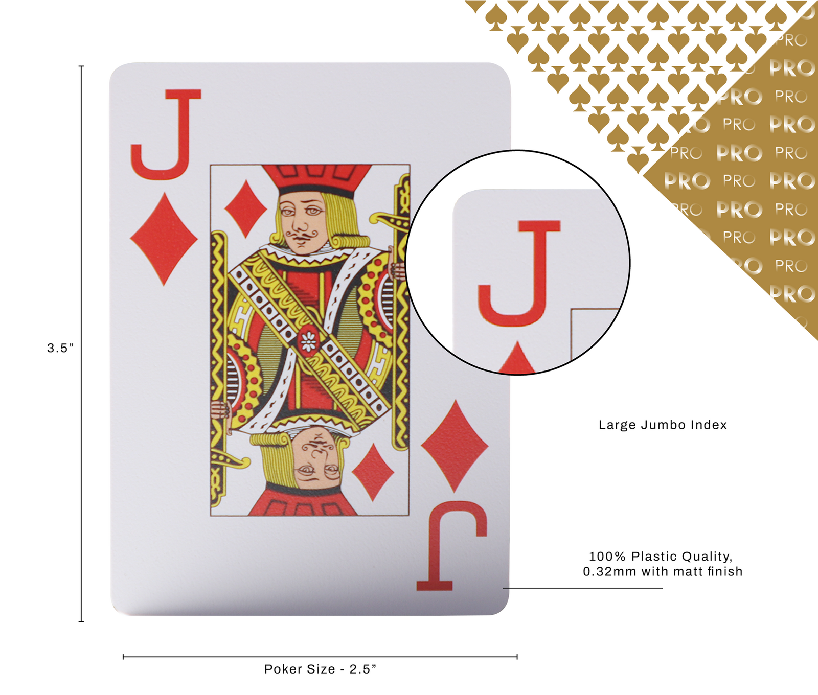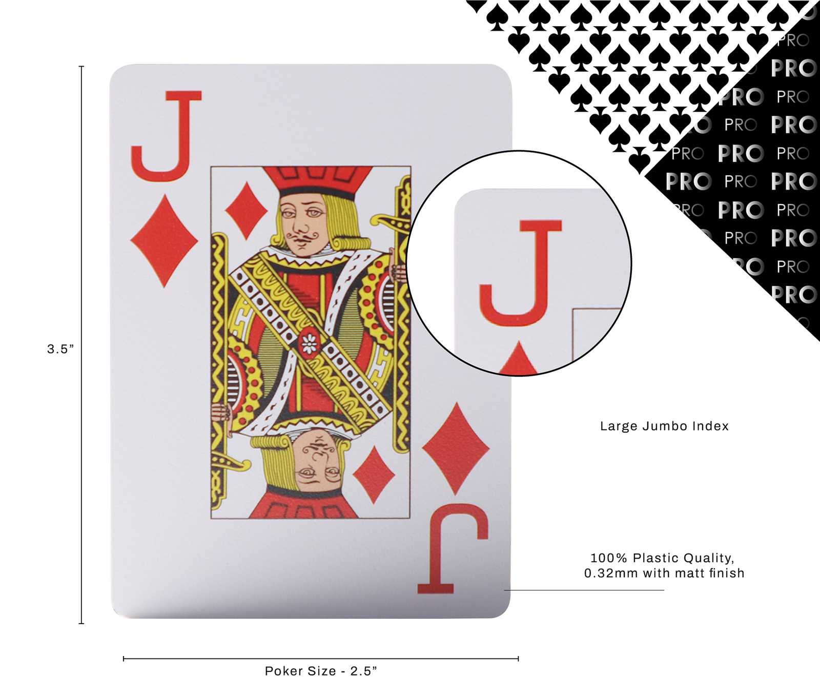 The JACKS PRO cards feature a traditional casino-style design with jumbo index faces for maximum clarity. Sized at the standard 3.5" x 2.5" poker format, they offer excellent visibility and a familiar feel at the table.