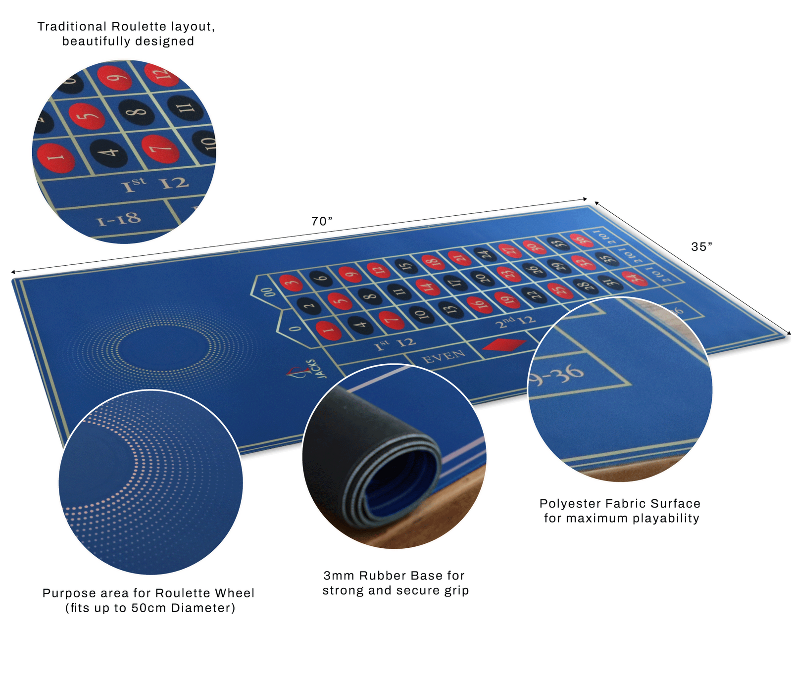 The mat has been designed with a specific area for your Roulette wheel to be placed on, and can accomodate up to a 50cm diameter wheel.