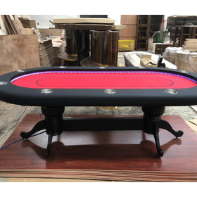 Casino grade black felt with cream detail / Wooden dual pedestal fixed legs / In built cup holders / Stock model
