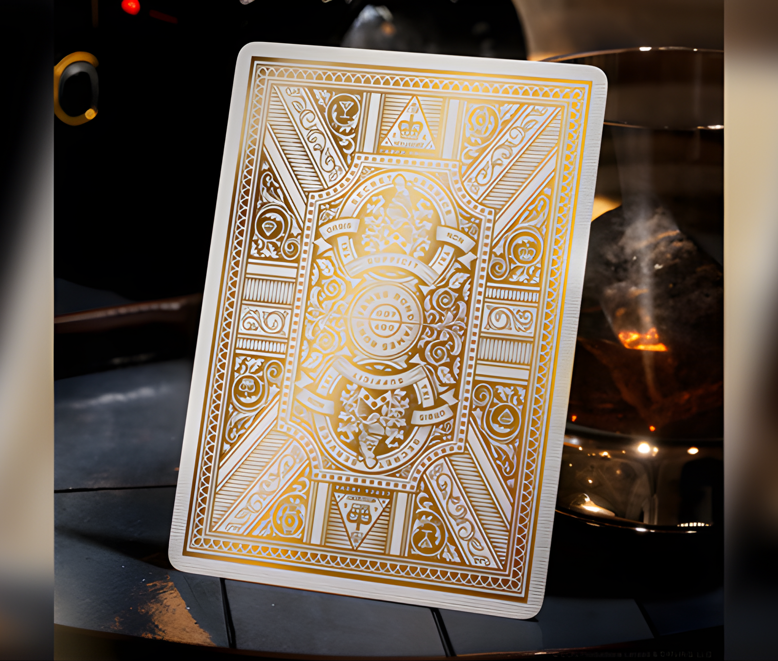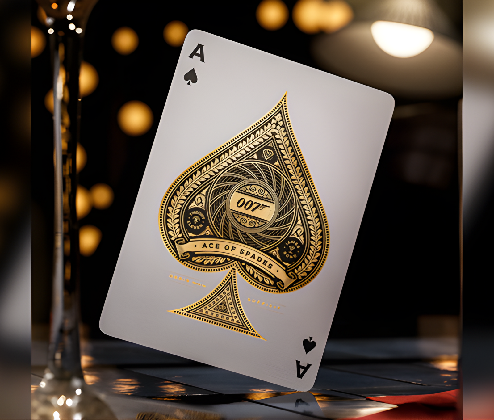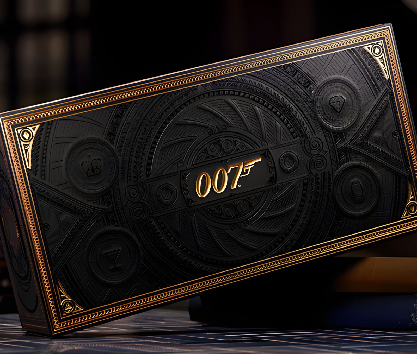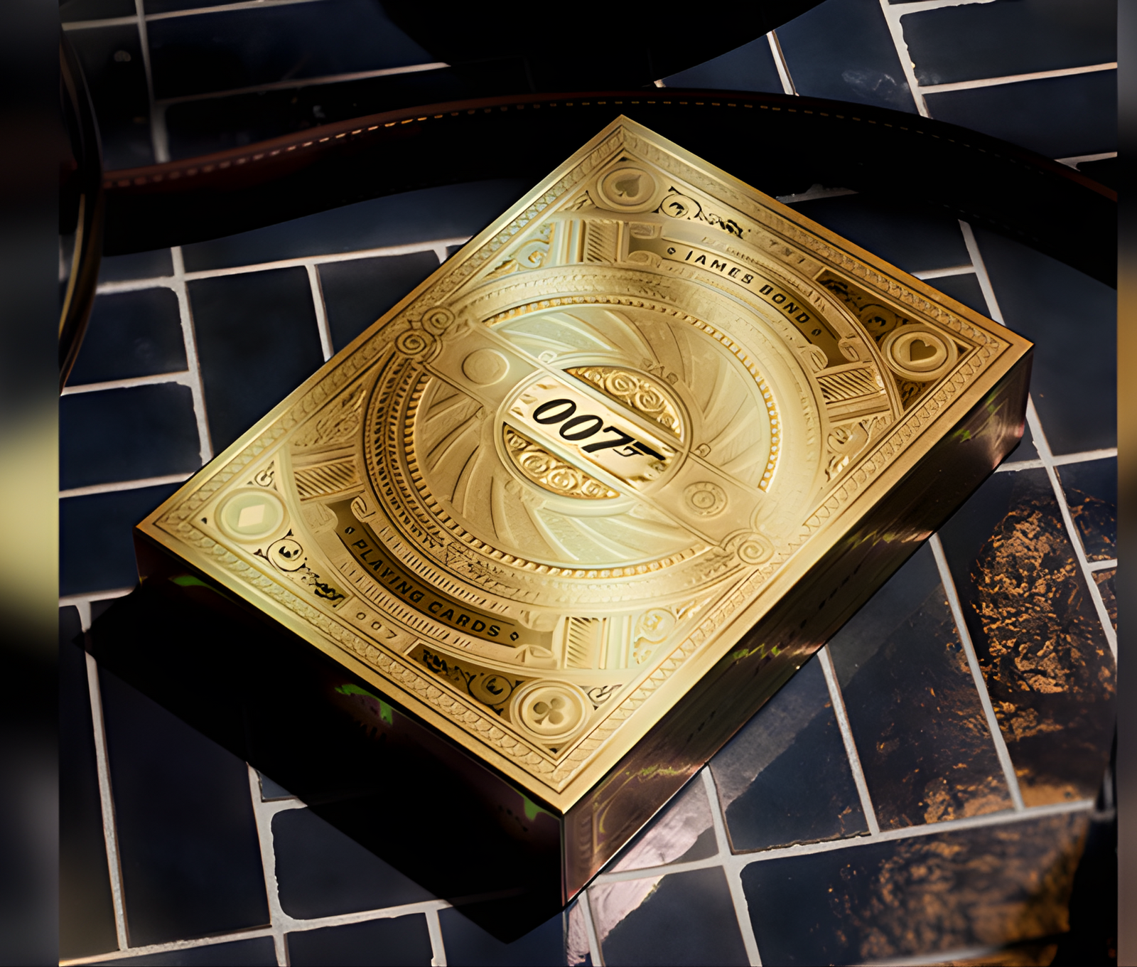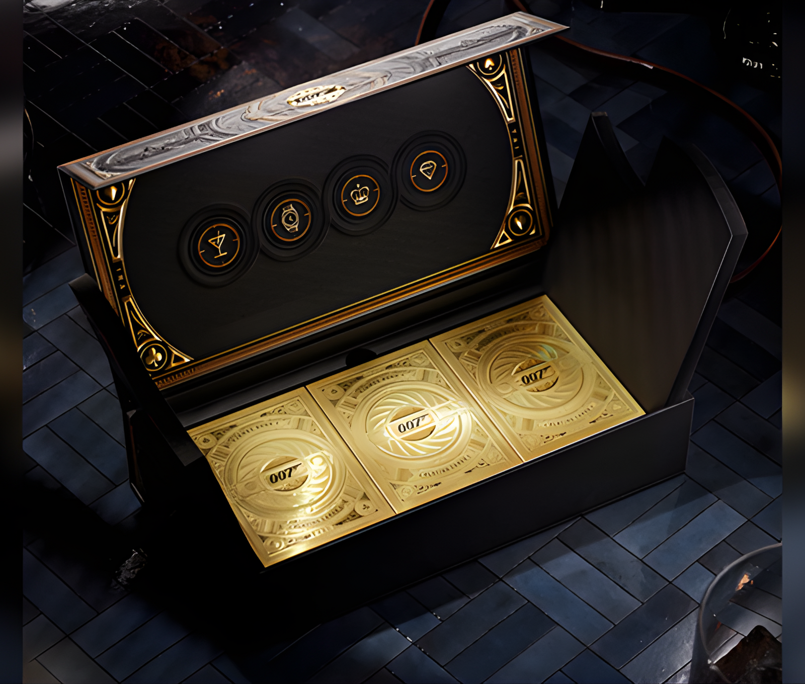 A special edition box set with a secret compartment, unlocked using a solid brass, handcrafted 007 pen. Inside are three decks of James Bond GOLD Edition Playing Cards.